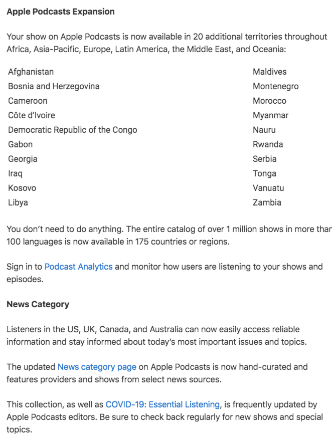 ? Apple Podcasts manda tus programas a 20 nuevos territorios llegando a un total de 175 países/regiones, y ahora la sección de Noticias está curada por editores (igual que la de Covid-19)