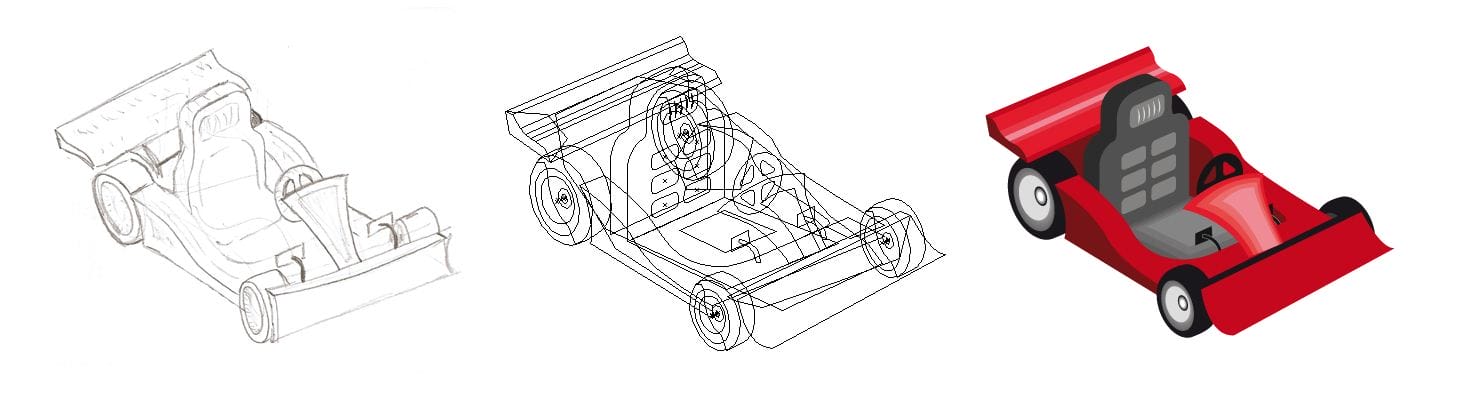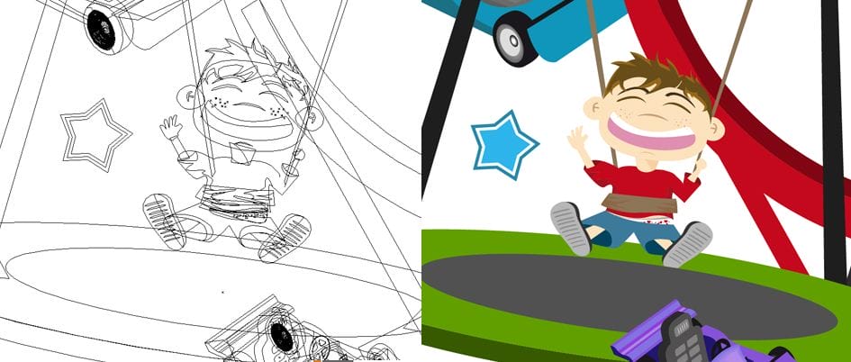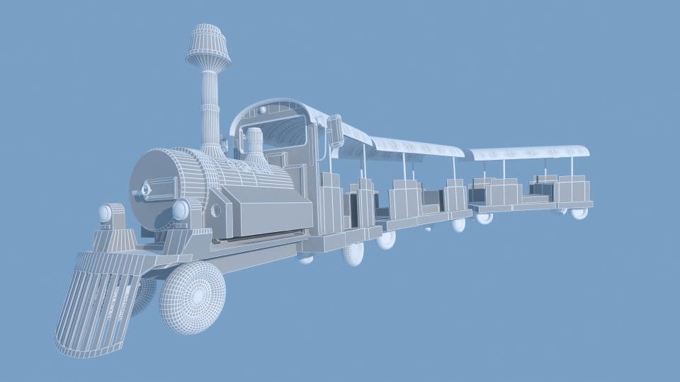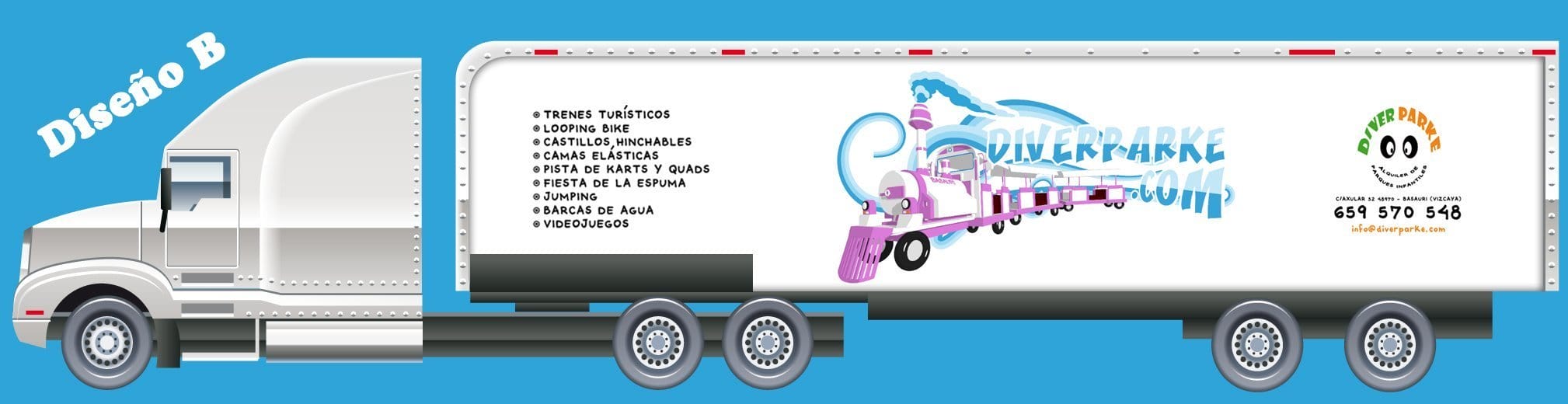 También hicimos un diseño de vinilos para decorar un trailer, en el que destaca la ilustración de una de las atracciones del cliente. Tras la realización de varios bocetos, se creó el modelo en 3D, con el que poder mover las piezas y cambiar la vista. Completamos el modelo con una texturización a base de materiales tipo Cell Shadding para darle un aspecto más cartoon al modelo. Después se completaron los detalles gráficos, con diversos pinceles personalizados.